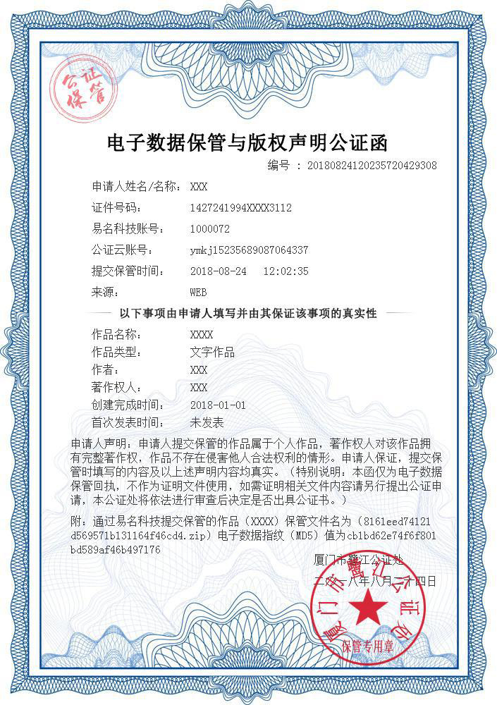 将用户的原创作品以电子数据的形式在国家公证处进行存证。权威高效。